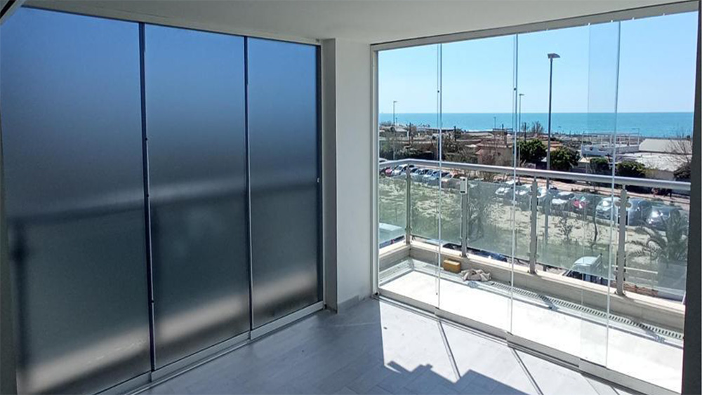Profili minimali, guide a pavimento calpestabili e opzioni personalizzate. Vuoi più riservatezza? Possiamo installare vetrate con finitura satinata o fumé, ideali per condomini o piani bassi, garantendo privacy senza rinunciare alla luce.